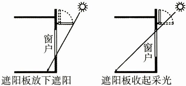 )①安装高度不变,加长遮阳板 ②安装高度不变,缩短遮阳板 ③遮阳板长度不变,降低安装高度 ④遮阳板长度不变,升高安装高度