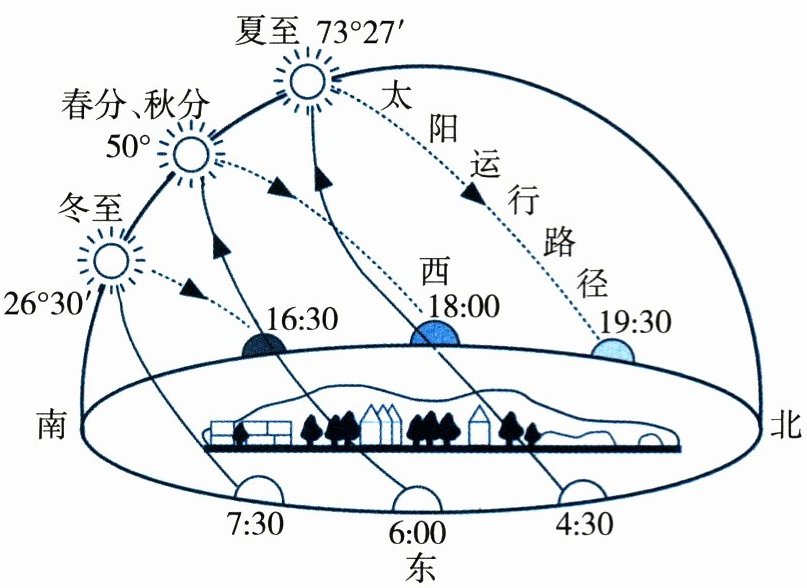 8. 读一年中二分二至的太阳升落示意图,回答下列问题。