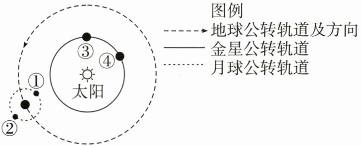 “月掩金星”是指金星被月球遮盖的自然现象,此时月球运行到地球和金星中间,且连成一条直线。2023年3月24日,我国部分地区观测到这一难得的天文奇观。读部分天体及其运行轨道示意图,完成3~4题。
