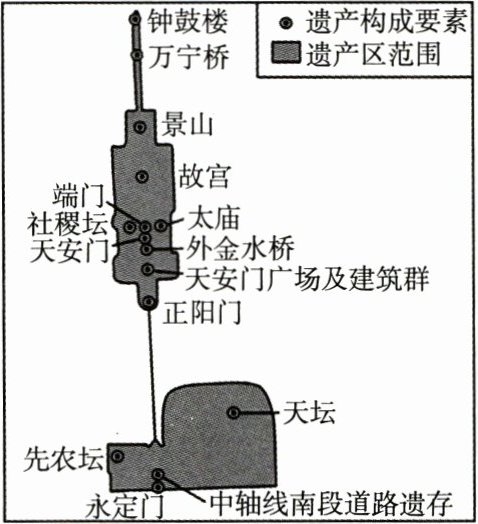 2024年7月27日,“北京中轴线”申遗成功,“北京中轴线”成为中国第59项世界遗产。下图示意“北京中轴线”。据此完成1~2题。