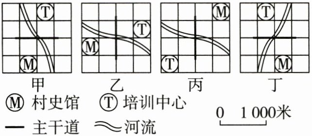 4. 某行政村东西长2千米,南北宽1千米,主干道从南向北通过,河流自东南向西北流过。该村拟修建村史馆和培训中心,分别位于该村西南部和东北部。与上述信息相符的是下图中的(