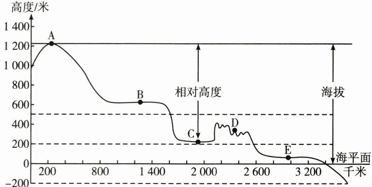 2. 判断图中字母 A、B、C、D、E 所处的地形类型(