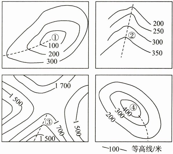 )A. ①山峰 ②山谷 ③山脊 ④盆地
