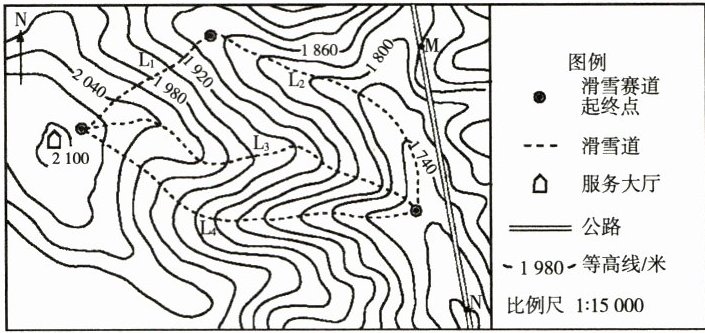 北京和张家口联合举办第 24 届冬奥会。读张家口某滑雪场等高线地形图,完成 10~11 题。