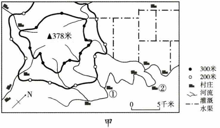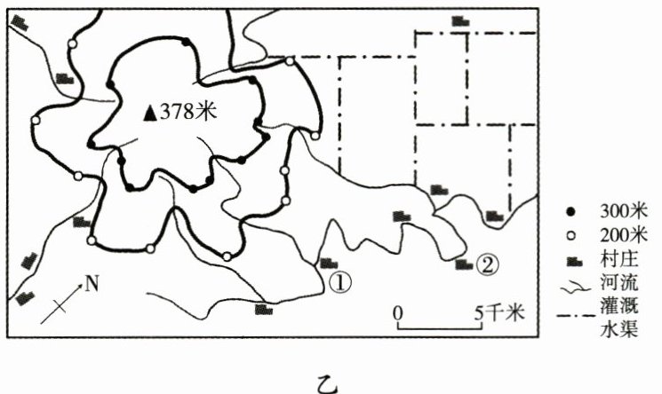 (2)乙 河流流经山谷,等高线向高海拔方向凸出