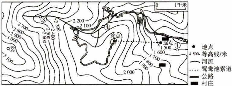 读云南某山地局部等高线示意图,完成 1~3 题。