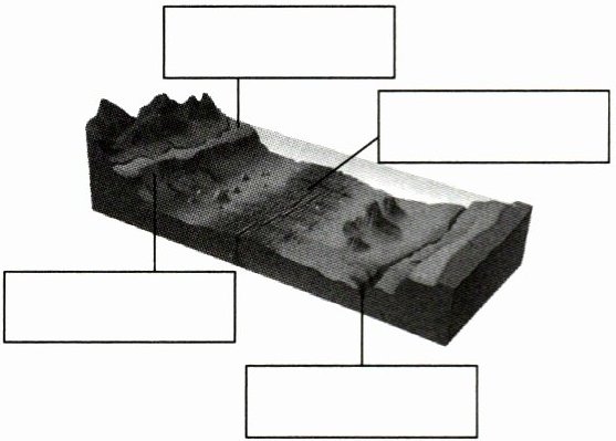 (从左到右或从上到下,根据插图实际标注位置依次填写)大陆架、大陆坡、海沟、洋盆、大洋中脊