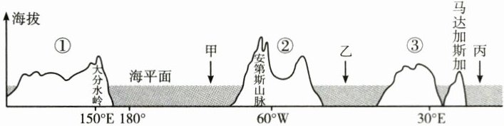 图中①②③④代表某大洋两岸的四块陆地。读图,完成2~3题。