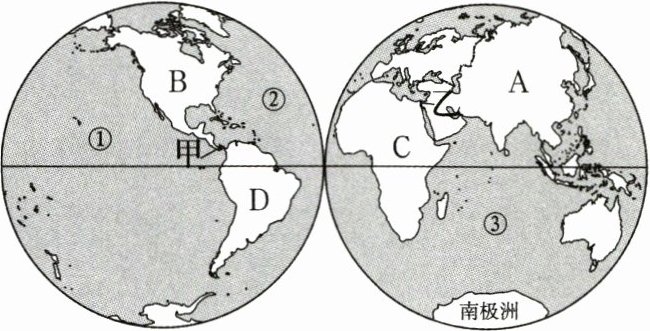 (1)东、西 (2)亚洲 北美洲 非洲(3)太平洋 大西洋 印度洋(4)巴拿马 北美 南美 苏伊士亚 非(5)C非洲大陆、D南美大陆