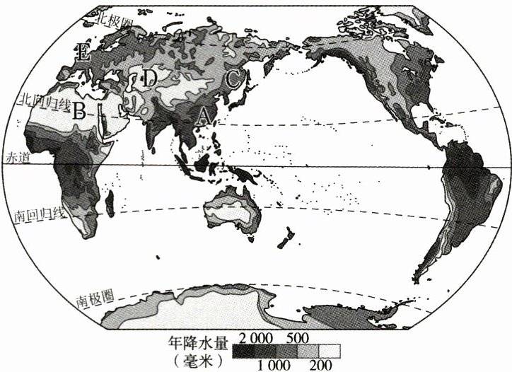 (3)C、D、E 处于亚欧大陆,其中降水较少的是