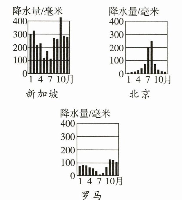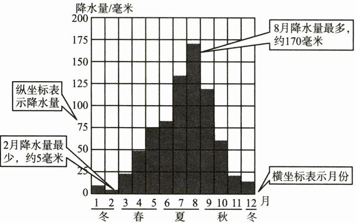 (2)阅读各月的降水量柱状图时要抓住两点:第一,各月降水量分配是否均匀;第二,哪个季节降水量多,哪个季节降水量少。