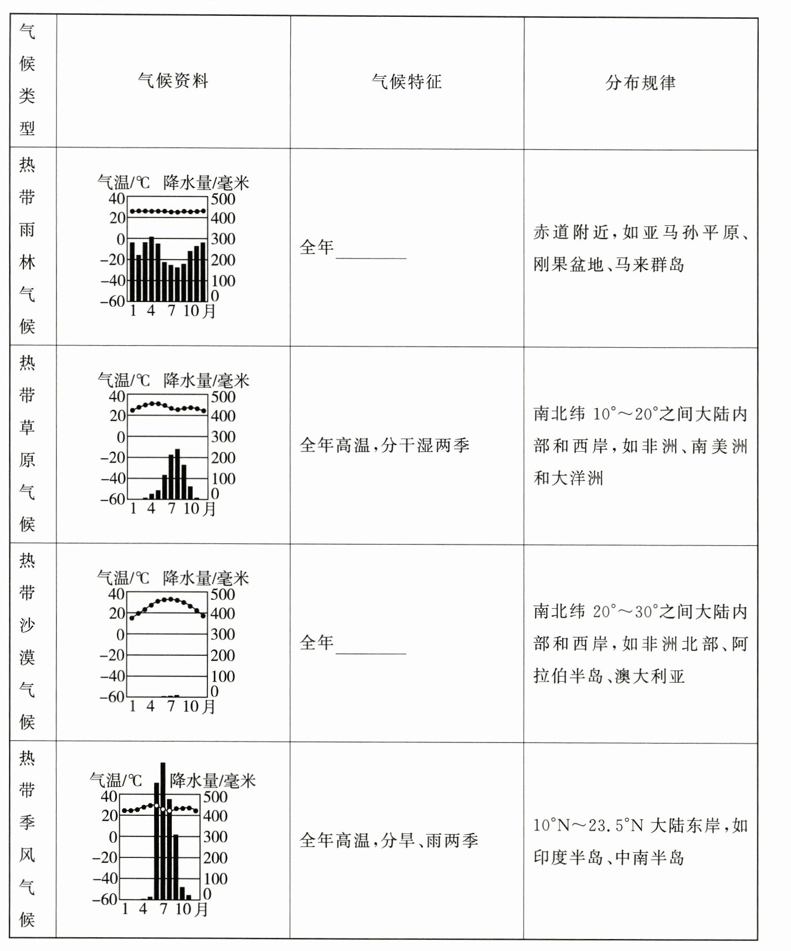 |南北纬 $20^{\circ} \sim 30^{\circ}$ 之间大陆内部和西岸,如非洲北部、阿拉伯半岛、澳大利亚||热带季风气候||全年高温,分旱、雨两季| $10^{\circ}N \sim 23.5^{\circ}N$ 大陆东岸,如印度半岛、中南半岛|
