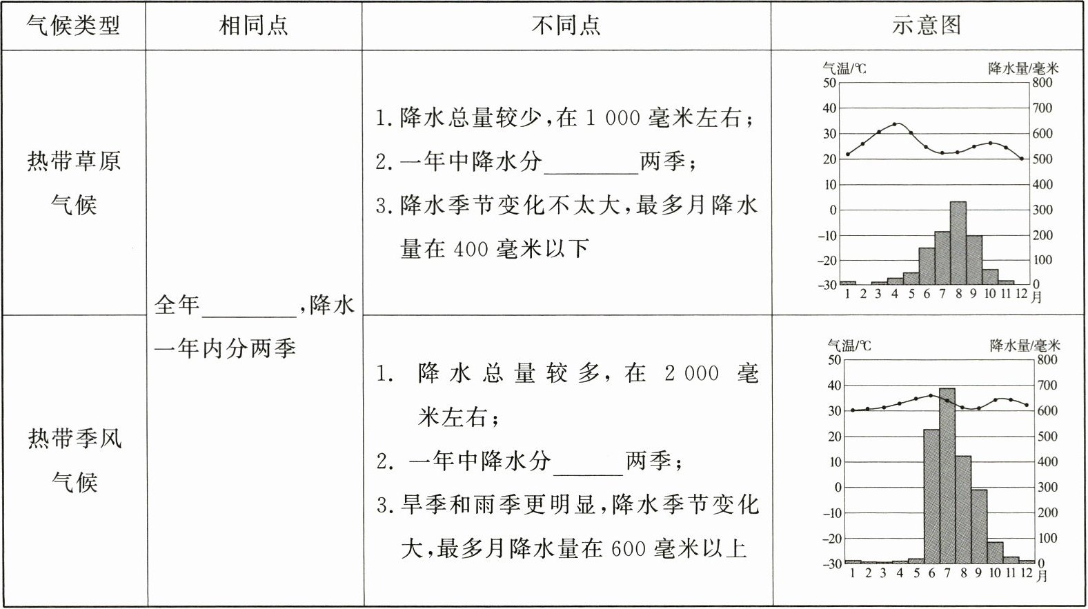 |热带草原气候|全年高温,降水一年内分两季|1. 降水总量较少,在1000毫米左右;