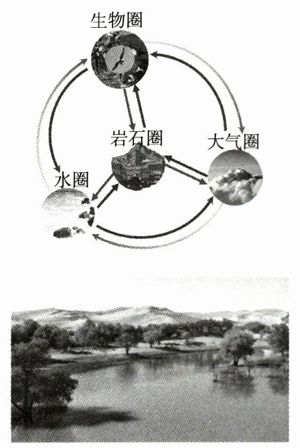 岩石圈、大气圈、水圈、生物圈相互作用,形成了人类赖以生存的地球表层环境。读地球表层圈层关系示意图和新疆胡杨林照片,完成4~6题。