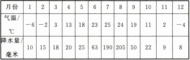 |气温/ $^{\circ}C$|-6|-2|3|13|18|23|25|24|19|11|2|-4|