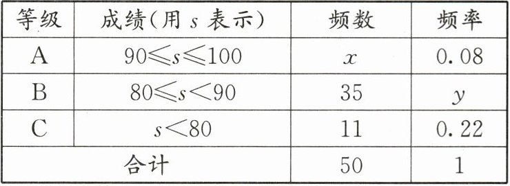 根据频率公式$频率=\frac{频数}{总数}$,已知总数$n = 50$,$A$等级频率$f_{A}=0.08$。