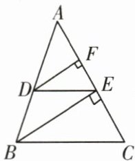 5. 如图,在$\triangle ABC$中,$DE // BC$,$BE \perp AC于点E$,$DF \perp AC于点F$,若$DE = 2$,$BC = 4$,$BE = 2\sqrt{3}$,且$\triangle ABC的周长为12$,求$\triangle ADE的周长和DF$的长度。