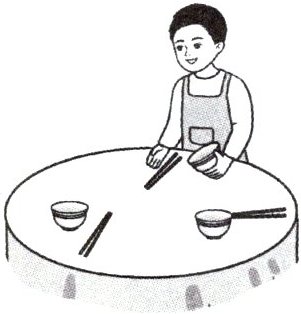 1. 明明参加“我爱做家务”的活动,下图中他正在摆碗筷。桌子上一共有多少根筷子?