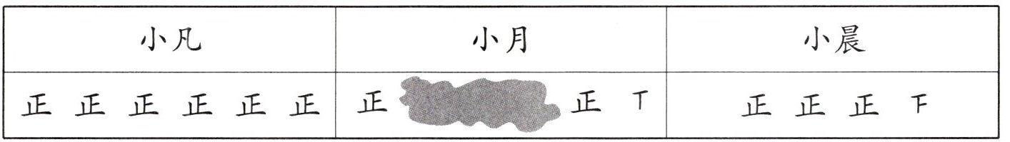 二(2)班在选班长,下面是黄老师用画“正”字的方法记录的每个竞选人的得票情况。(一画表示1票,一个“正”字表示5票)