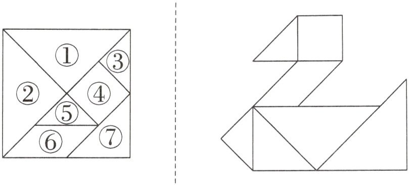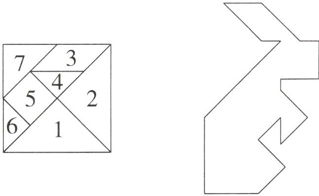 五、下面的右图是用七巧板拼成的图案,请你画线划分出七巧板中的图形,并给每块板标上与七巧板中对应的序号。