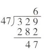1. $$\begin{array}{r} 6 \\ 47\enclose{longdiv}{329} \\ 282 \\ \hline 47 \end{array}$$ 改正: