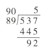 错解展示:$537÷89 = 5\cdots\cdots92$ $\begin{array}{r}90\\89\enclose{longdiv}{537}\\445\\\hline92\end{array}$
