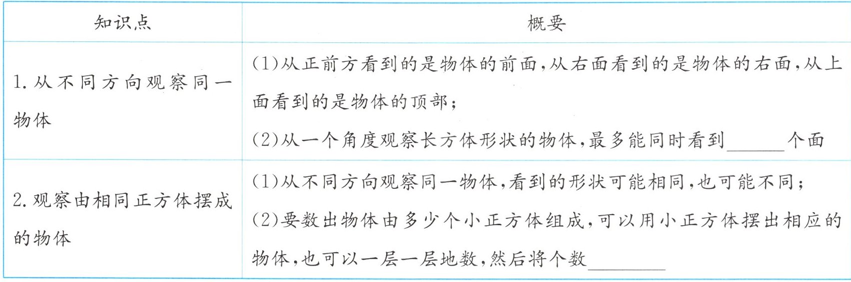 错因分析:观察物体时要从不同的角度去考虑,只考虑一个角度,观察物体是不全面的。本题易错误地理解成每排2个,有2排,共4个正方体组成的长方体,但本题并没有说拼成长方体,且题目中有“至少”两个字,因此可以摆成不规则的物体,如下图。