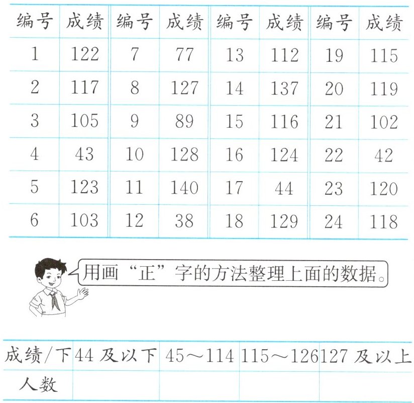 1. 将上表数据按要求用画“正”字的方法整理后填入下表。