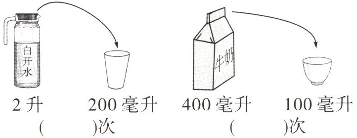 二、将白开水和牛奶分别倒入不同的杯子里饮用(如下图),分别需要倒几次才能全部倒完?(每次都倒满)