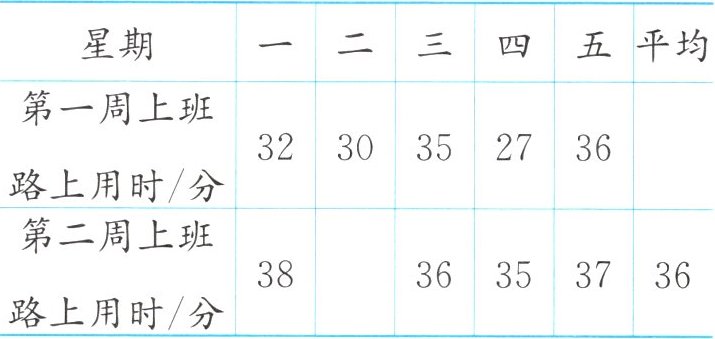 为响应国家“低碳环保,绿色出行”的号召,王叔叔最近两周采用不同的绿色出行方式上班,他第一周坐公交车,第二周骑自行车。下面是他记录的两周中每天上班路上的用时情况。