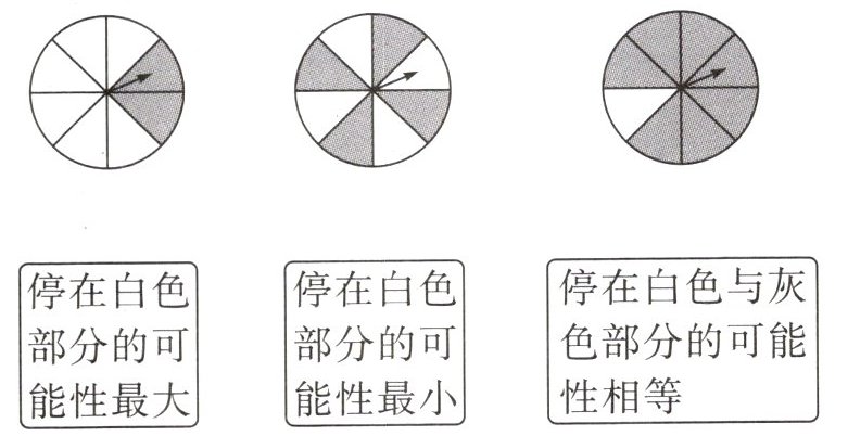 第一个圆连“停在白色部分的可能性最大”,第二个圆连“停在白色部分的可能性最小”,第三个圆连“停在白色与灰色部分的可能性相等”