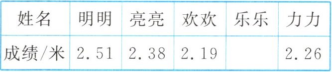 1. 五年级一班的 5 名同学参加跳远比赛,他们的成绩如下表。(所有成绩保留两位小数,不存在名次并列现象)