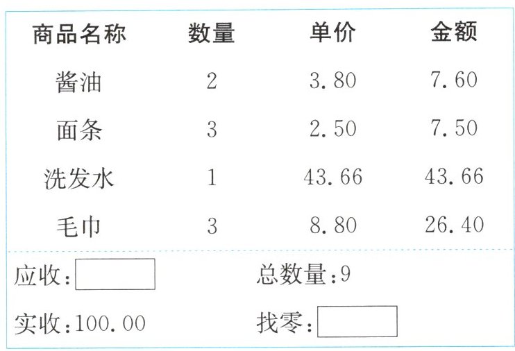 1. 把下面的小票补充完整。(用计算器计算)