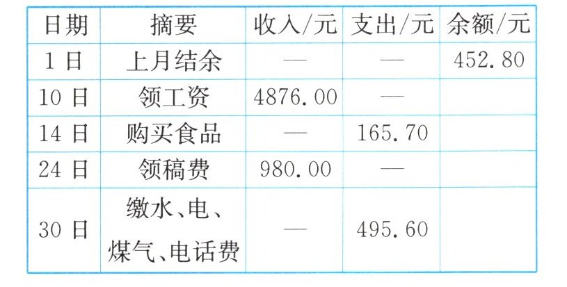 |日期|摘要|收入/元|支出/元|余额/元|