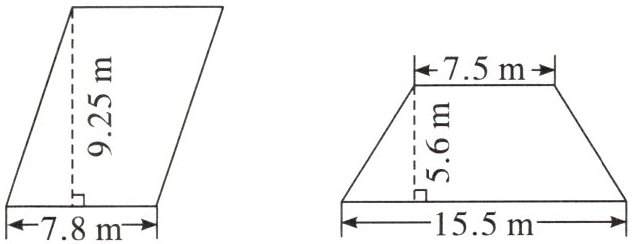 综上,长方形面积为$65.86m^{2}$,三角形面积为$43.16m^{2}$,平行四边形面积为$72.15m^{2}$,梯形面积为$64.4m^{2}$。