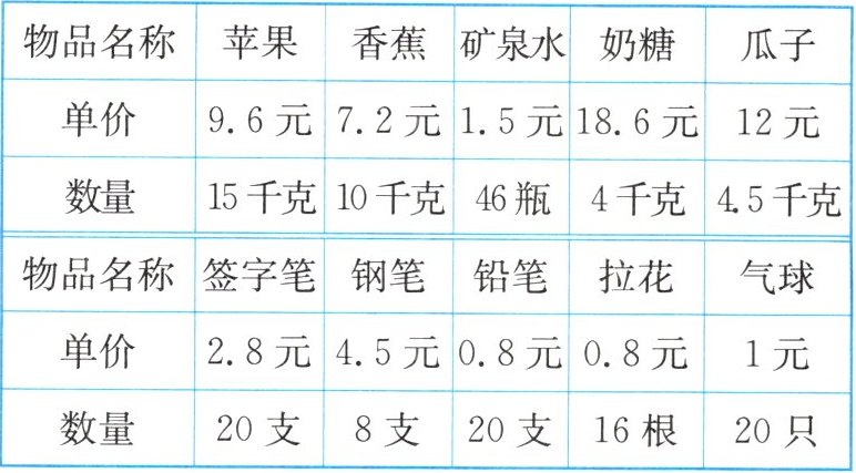 今年元旦,班级举办联欢会,班委通过问卷调查,根据大家的喜好,最后确定购买以下物品。