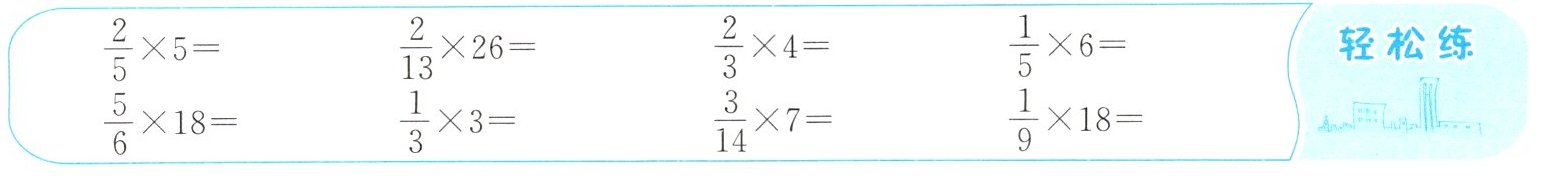 $\frac{2}{5}×5 = 2$;$\frac{2}{13}×26 = 4$;$\frac{2}{3}×4 = \frac{8}{3}$;$\frac{1}{5}×6 = \frac{6}{5}$;$\frac{5}{6}×18 = 15$;$\frac{1}{3}×3 = 1$;$\frac{3}{14}×7 = \frac{3}{2}$;$\frac{1}{9}×18 = 2$。