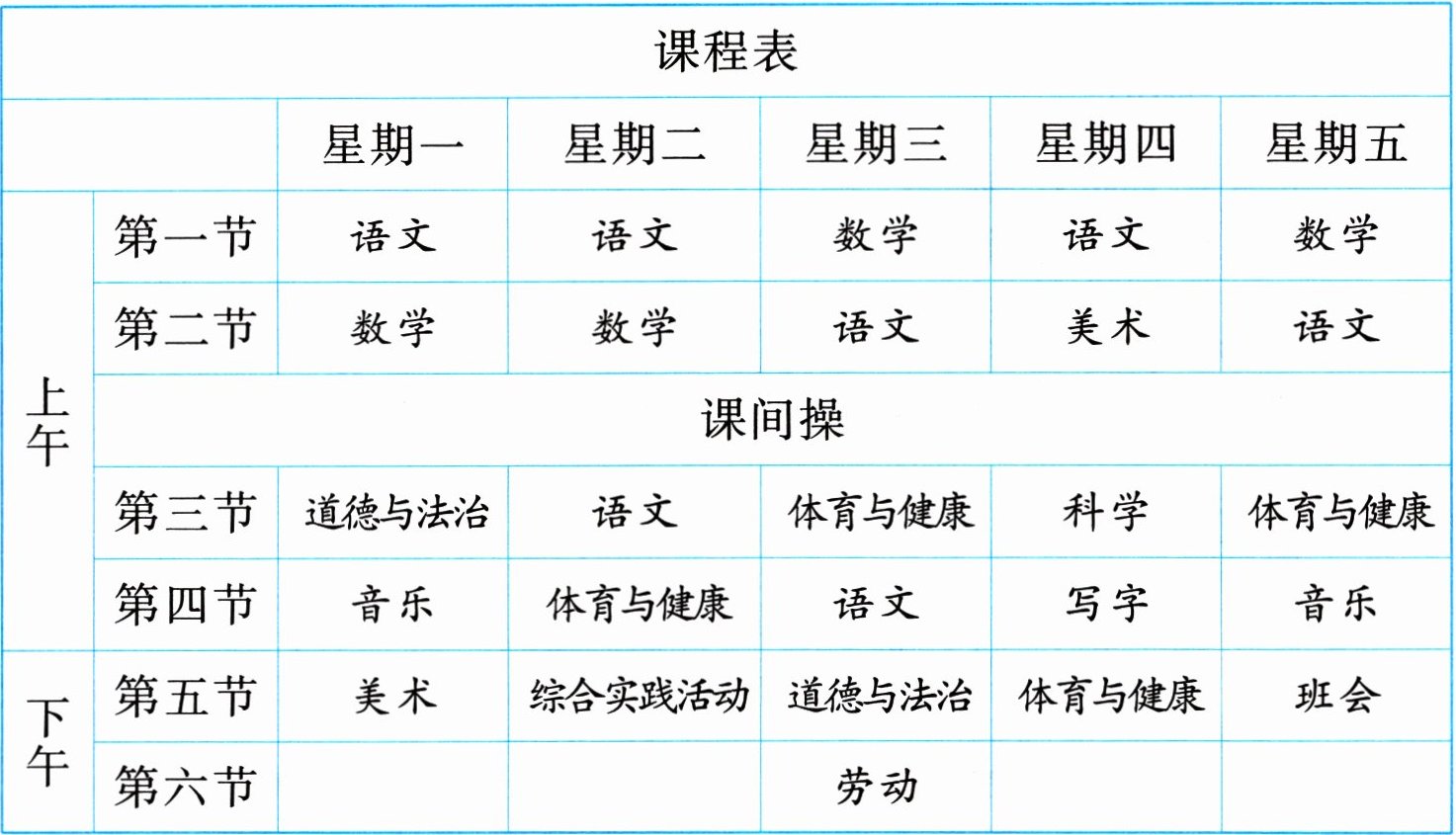 1. 用 “__” 圈出课程 表 中 星期三的第二节课。