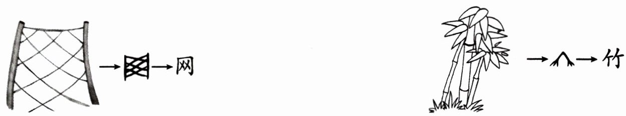 示例:“网”,古字形像是张开的网,意思是用绳线等结成的捕鱼捉鸟的器具。 “竹”,古字形像是下垂的竹叶,意思是竹子。