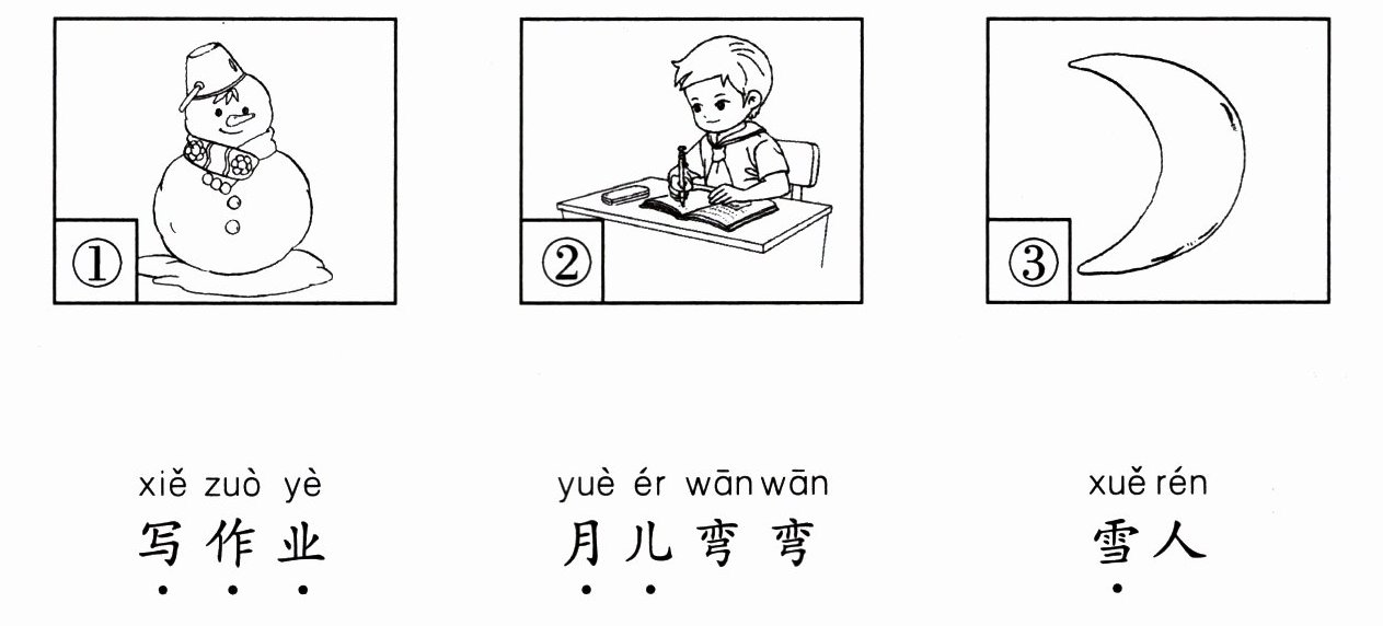 1. 图①—雪人 图②—写作业 图③—月儿弯弯 2.(1)x z (2)ie üe er (3)ye yue