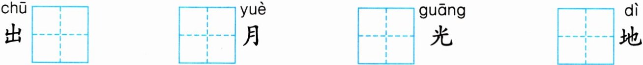 chū$\begin{array}{|c|}\hline kǒu \\ \hline\end{array}\\ \hline $$\begin{array}{|c|}\hline rì \\ \hline\end{array}\\ \hline $yuè$\begin{array}{|c|}\hline mù \\ \hline\end{array}\\ \hline $guāng$\begin{array}{|c|}\hline tián \\ \hline\end{array}\\ \hline $dì