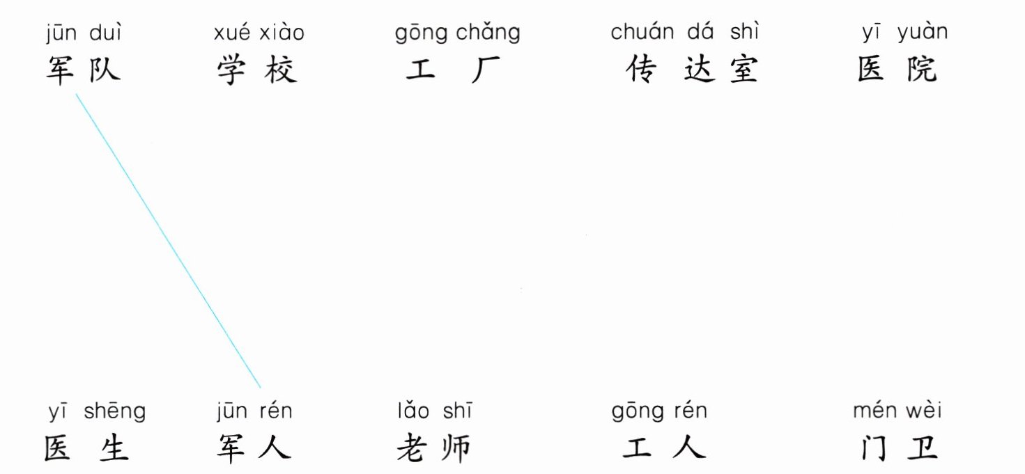 医生 yī shēng 军人 jūn rén 老师 lǎo shī 工人 gōng rén 门卫 mén wèi