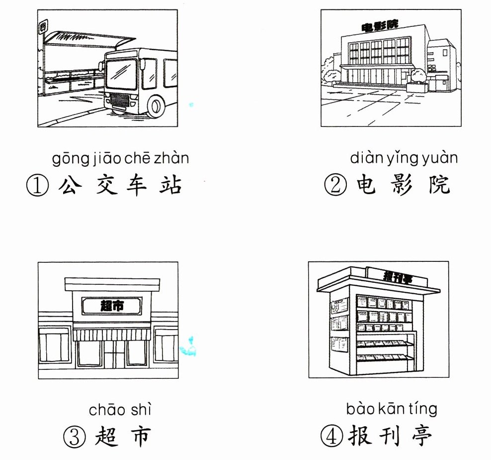 ①公交车站 gōng jiāo chē zhàn ②电影院 diàn yǐng yuàn