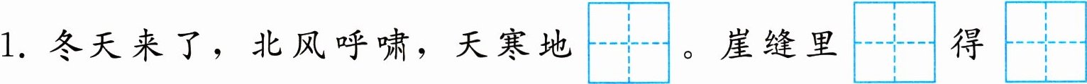 1. 冬天来了,北风呼啸,天寒地$\begin{array}{|c|}\hline d\grave{o}ng \\ \hline\end{array}\\ \hline $。崖缝里$\begin{array}{|c|}\hline l\check{e}ng \\ \hline\end{array}\\ \hline 得\begin{array}{|c|}\hline xi\grave{a}ng \\ \hline\end{array}\\ \hline $$\begin{array}{|c|}\hline b\bar{i}ng \\ \hline\end{array}\\ \hline $窖。