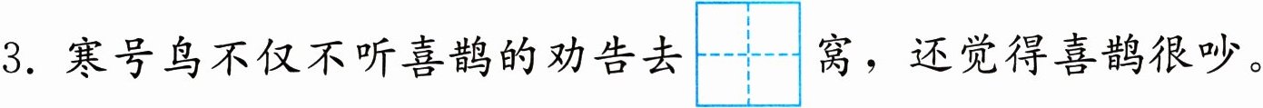 3. 寒号鸟不仅不听喜鹊的劝告去$\begin{array}{|c|}\hline zu\grave{o} \\ \hline\end{array}\\ \hline $窝,还觉得喜鹊很吵。