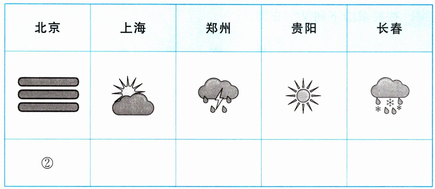 1. 照样子,将图标对应的天气填在表格里。(填序号)