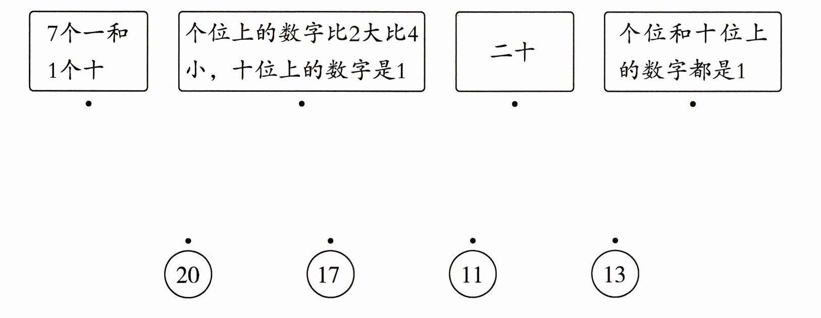 7个一和1个十连17,个位上的数字比2大比4小,十位上的数字是1连13,二十连20,个位和十位上的数字都是1连11。