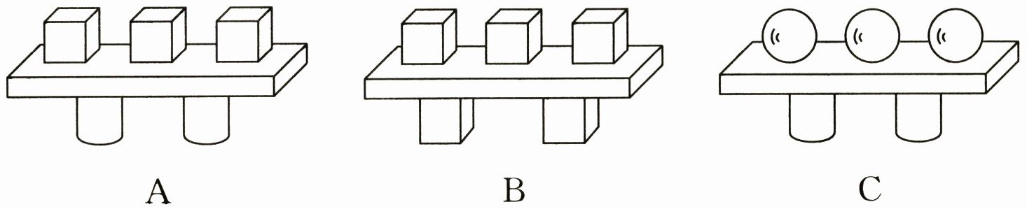 3. 在2个圆柱的上面放1个长方体,再在长方体上面放3个正方体。搭得正确的是( )。