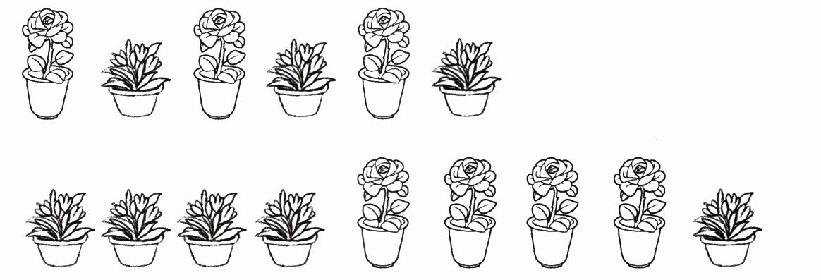 (2)算式“$7+8= 15$”表示( )有 7 盆,( )有 8 盆,一共有 15 盆花。(圈出正确答案)