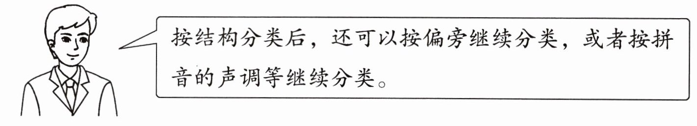 按结构分类后,还可以按偏旁继续分类,或者按拼音的声调等继续分类。